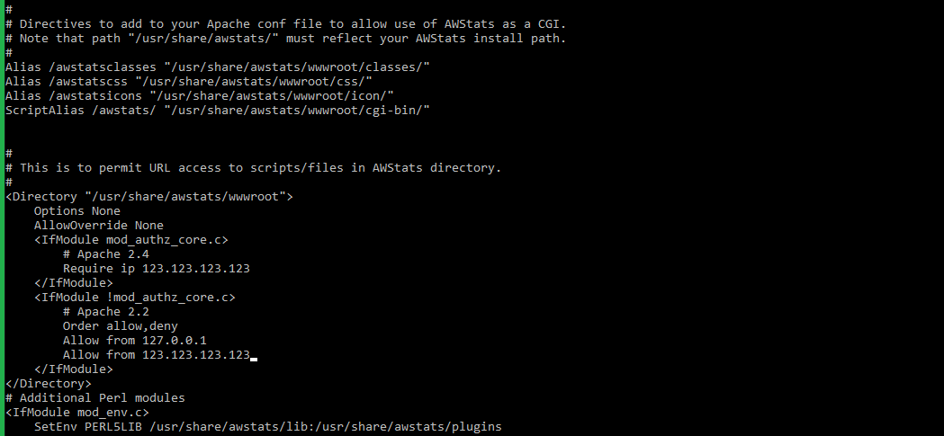 开始为 AWStats 配置 Apache,默认的 AWStats 配置文件位于路径/etc/httpd/conf.d/awstats.conf. 除了允许访问的情况外,此默认配置很有用。如果需要从特定网络外部访问 AWStats,则需要在 AWStats 配置文件中允许网络的 IP 地址。